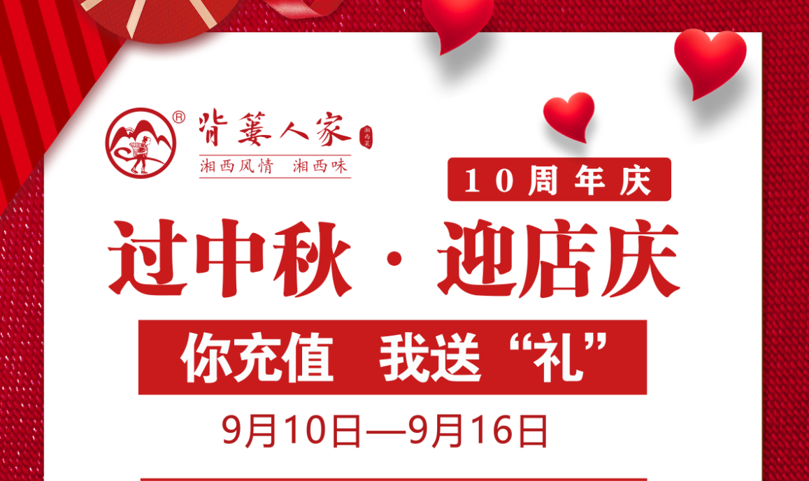 背簍人家市委店 過中秋10周年店慶 時間:9月10日-9月16日 01 充值送超級禮包 ①一次性充值2000元,得2898元(贈送400元積分,再送498元茅臺鎮(zhèn)醬酒1瓶)。 ②一次性充值500......
